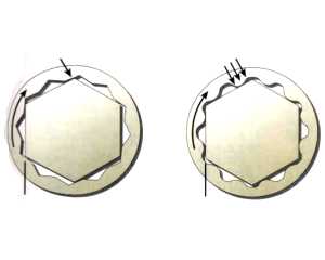 esquina, asi como una sección de flanco adicional que transmite la torsión a la cabeza del tornillo o tuerca. Este contacto de flanco garantiza una máxima distribución de la carga y evita cualquier daño en la