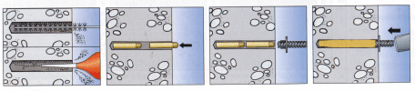 espera. Mediante la introducción a golpes de la varilla, se rompen las ampollas de vidrio. El mortero especial,activado de esta forma, sujeta firmemente desde el principio la barra de armado, incluso sobre un hormigón