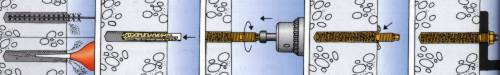 Efectuar el agujero y extraer bien el polvo resultante. Comprobar el estado de la ampolla FHP antes de introducirla en el agujero. La resina de una ampolla en buen estado deberá fluir como si fuera miel. Limpiar